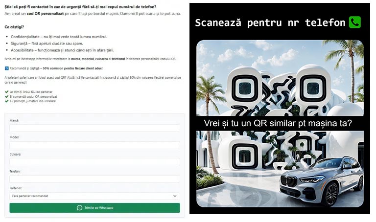 Am creat un cod QR personalizat pe care îl lași pe bordul mașinii. Oamenii îl pot scana și te pot suna.